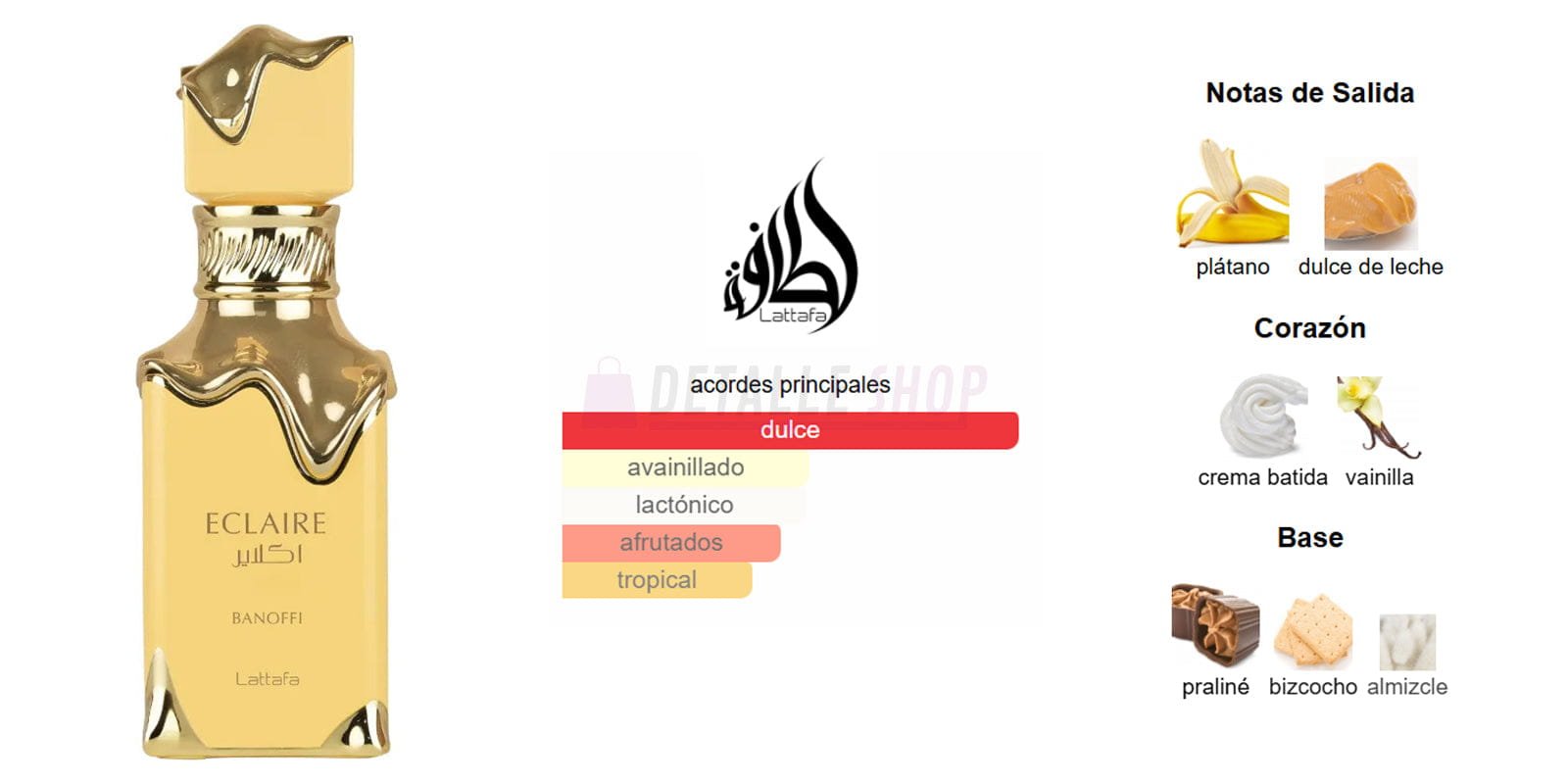 Inspirado en el famoso pastel inglés de plátano, toffee y crema, Eclaire Banoffi ofrece una experiencia olfativa única. Es una mezcla deliciosa que combina notas cálidas y frutales con un fondo cremoso.