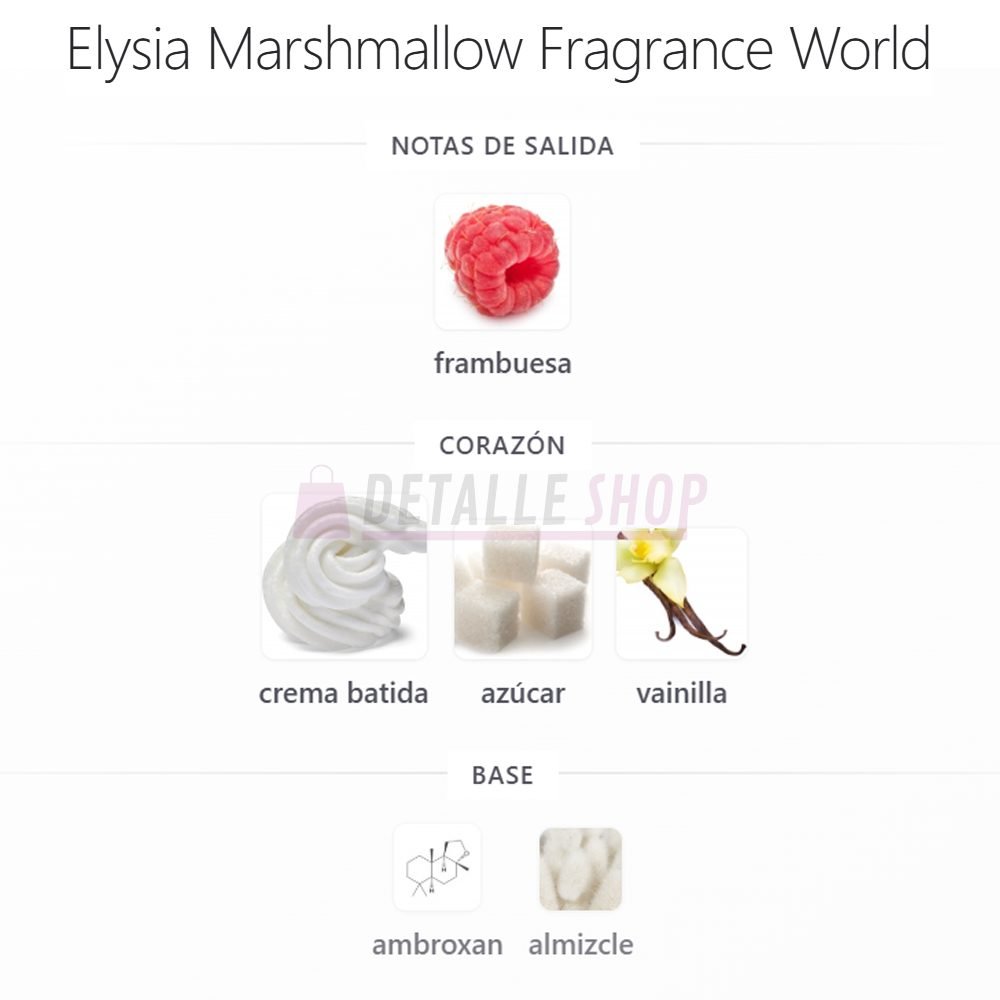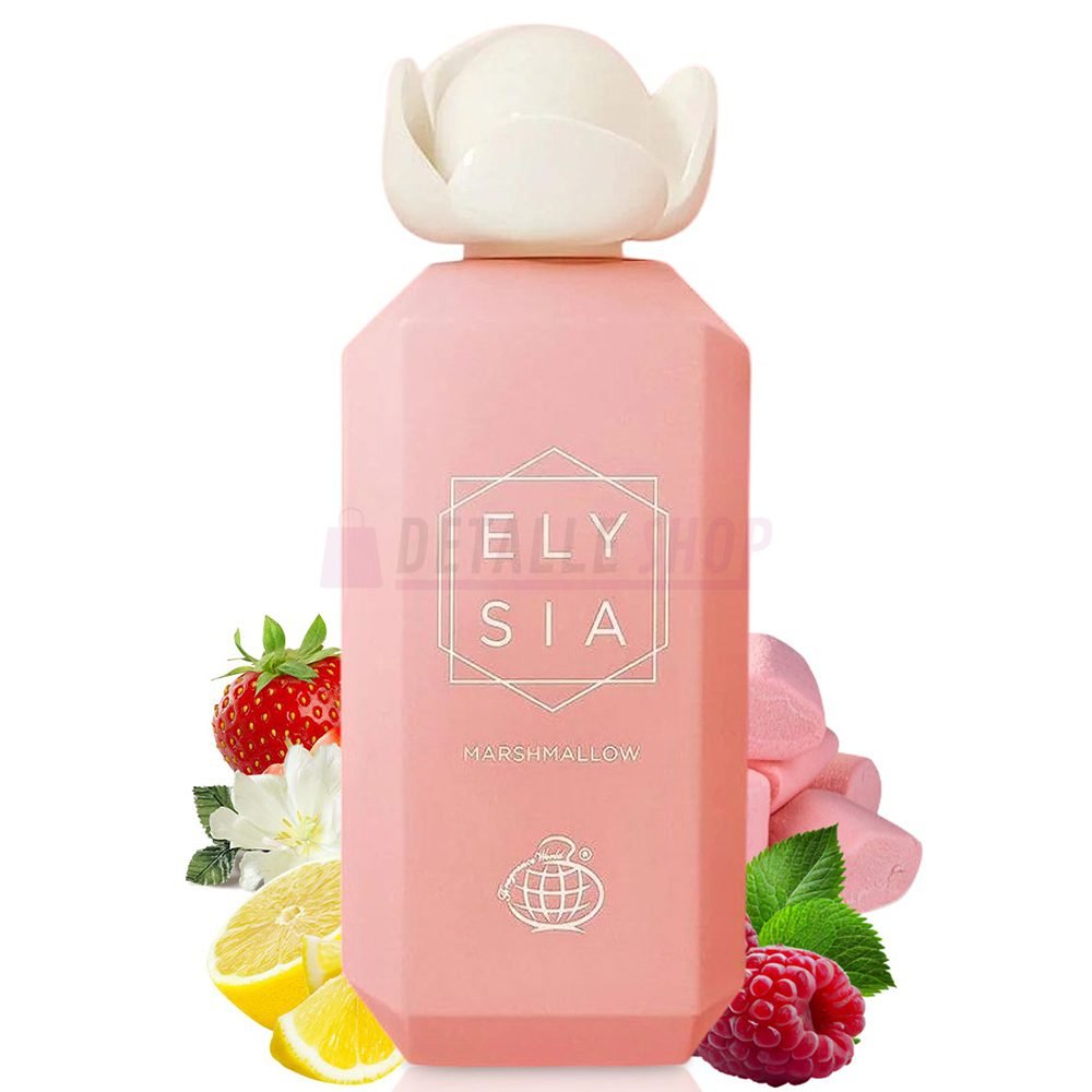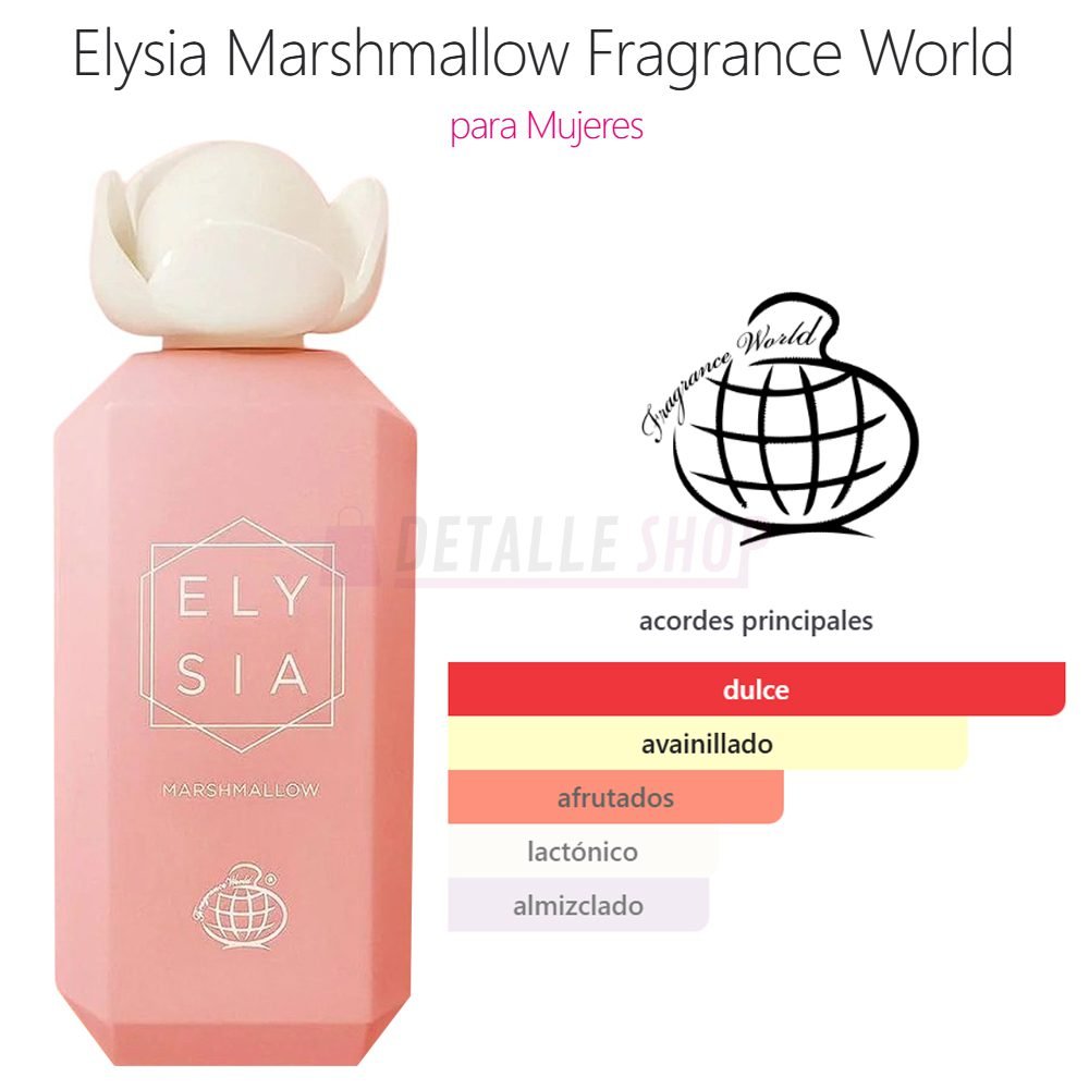 Elysia Marshmallow, un perfume dulce y cremoso con aroma a marshmallow, vainilla y azúcar. Ideal para mujeres que buscan una fragancia gourmand irresistible y asequible.