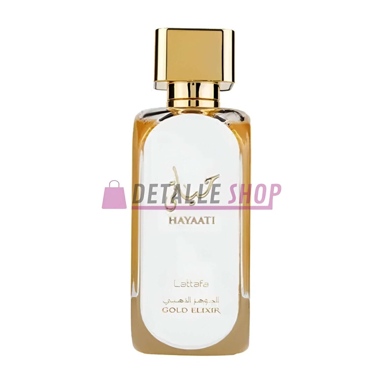 Hayaati Gold Elixir de Lattafa es un perfume árabe unisex cálido y sofisticado. Destacan bergamota, durazno, azafrán, vainilla y ámbar, creando un aroma elegante, envolvente y duradero. Perfecto para destacar con lujo y distinción.