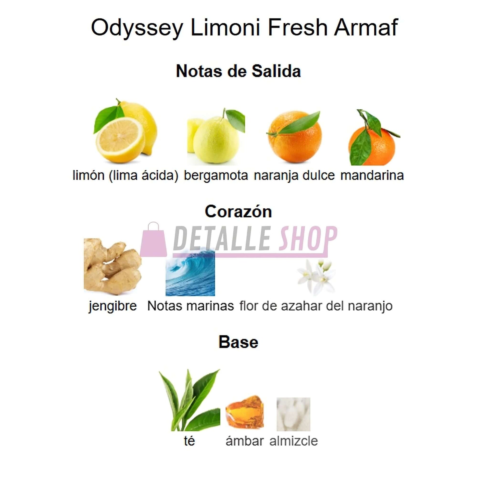 Odyssey Limoni de Armaf es un perfume árabe cítrico para hombre que combina notas frescas de limón, bergamota y especias, creando una fragancia energizante y sofisticada. Ideal para el uso diario, deja una estela de frescura y elegancia. Perfecto para quienes buscan un aroma único y duradero.