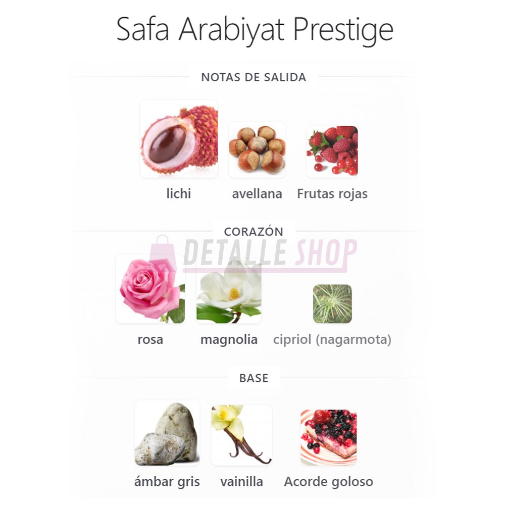 Safa de Arabiyat Prestige es una fragancia de la familia olfativa Floral Frutal Gourmand, elegante y envolvente, con gran duración. Ideal para destacar y dejar una impresión inolvidable