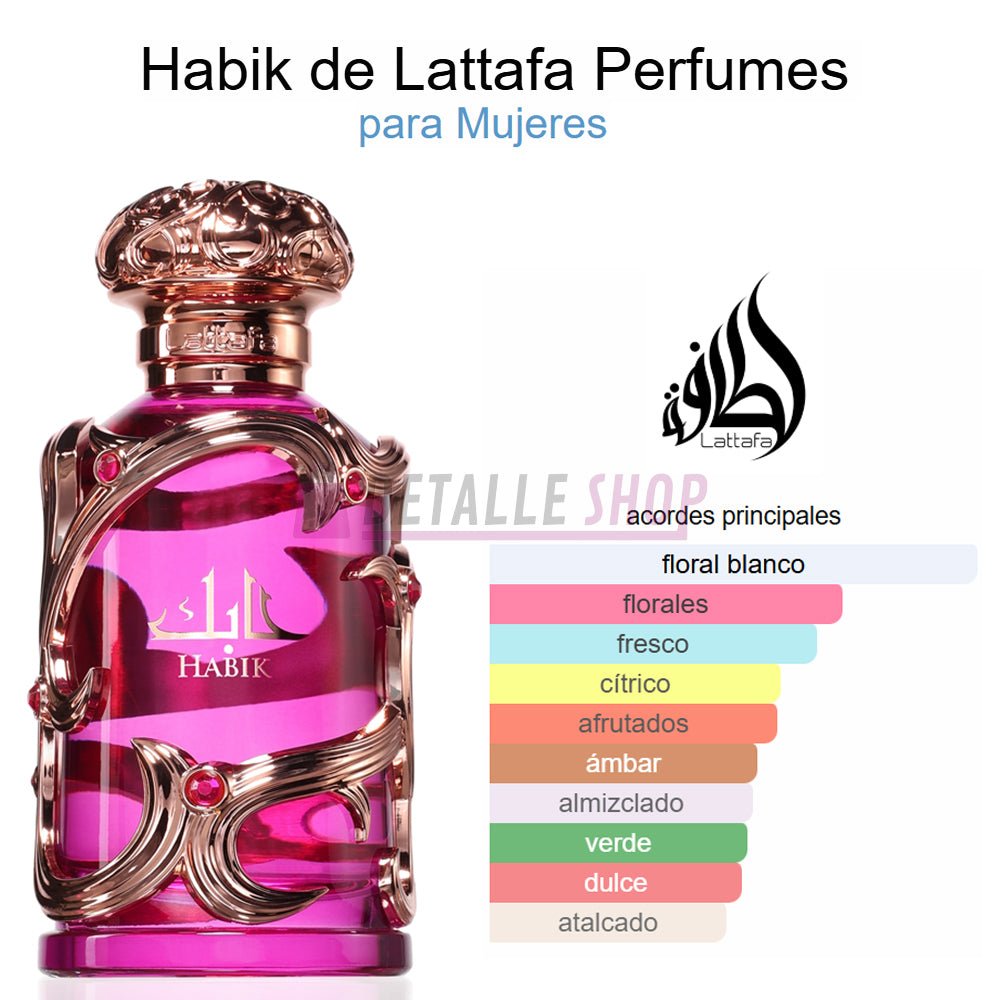 Descubre Habik de Lattafa para mujer, un perfume árabe floral y afrutado con notas de pera, bergamota, jazmín y almizcle. Su aroma elegante y duradero envuelve tus sentidos, dejando una estela sofisticada e irresistible. Perfecto para destacar con estilo en cualquier ocasión.
