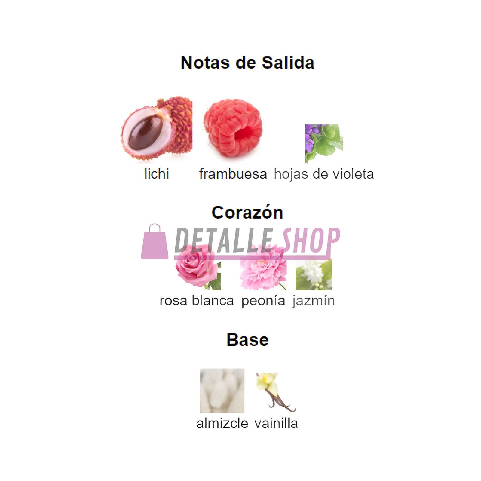 Notas de salida:  lichi, frambuesa, hoja de violeta