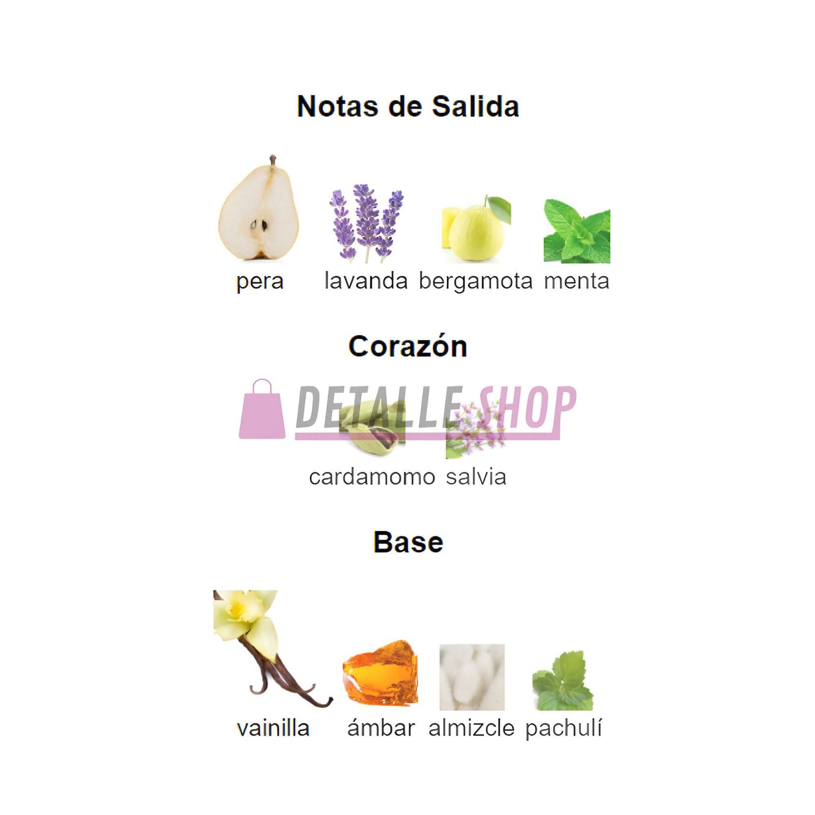 Notas de corazón: Cedro, Ciprés, Flor de olivo, Heliotropo.