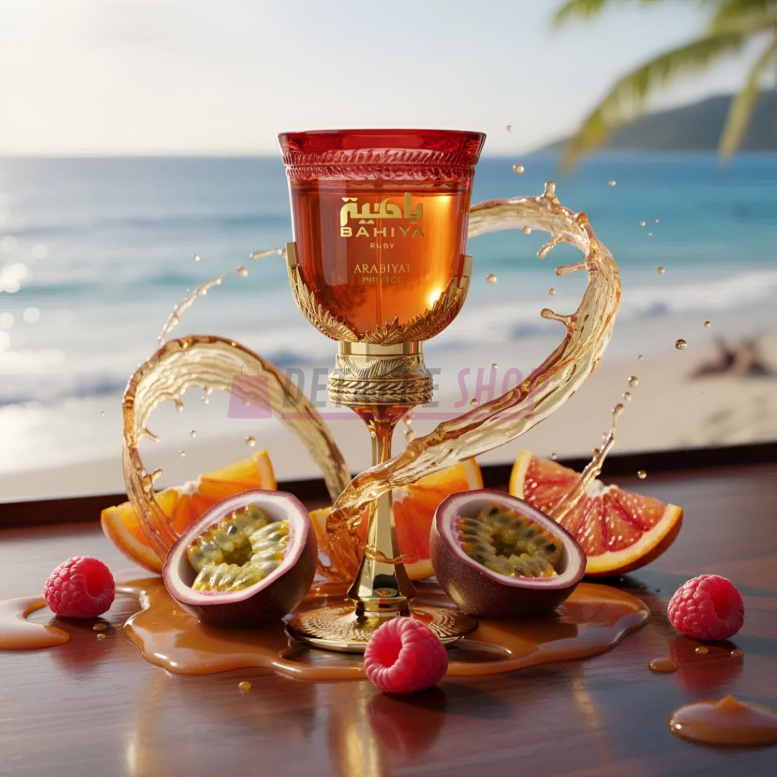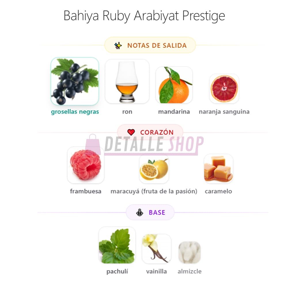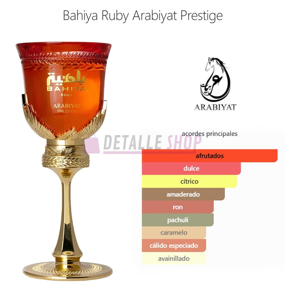 Bahiya Ruby de Arabiyat Prestige es un Eau de Parfum femenino irresistible, con notas frutales, gourmand y un fondo cálido de vainilla y almizcle. Dulce, elegante y envolvente, es el perfume perfecto para destacar y dejar huella allá donde vayas.