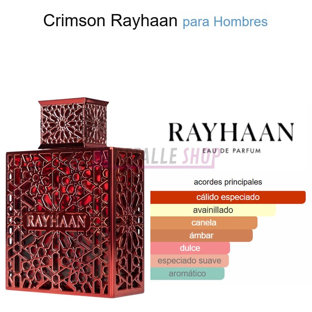 Crimson de Rayhaan es una fragancia intensa y sofisticada que combina especias cálidas, notas dulces y un fondo envolvente. Ideal para quienes buscan un perfume elegante, duradero y seductor que destaque en cada ocasión. Atrévete a dejar huella.