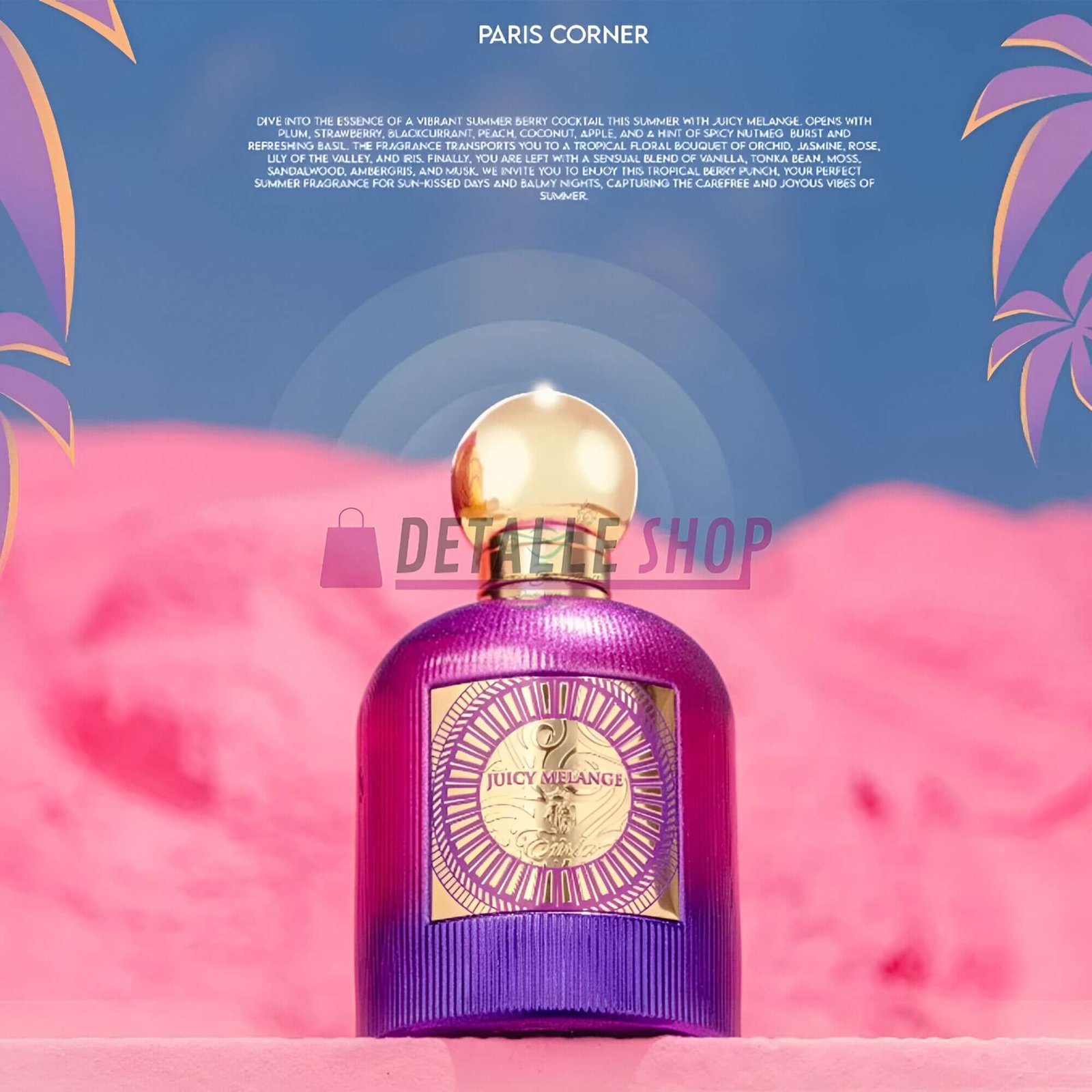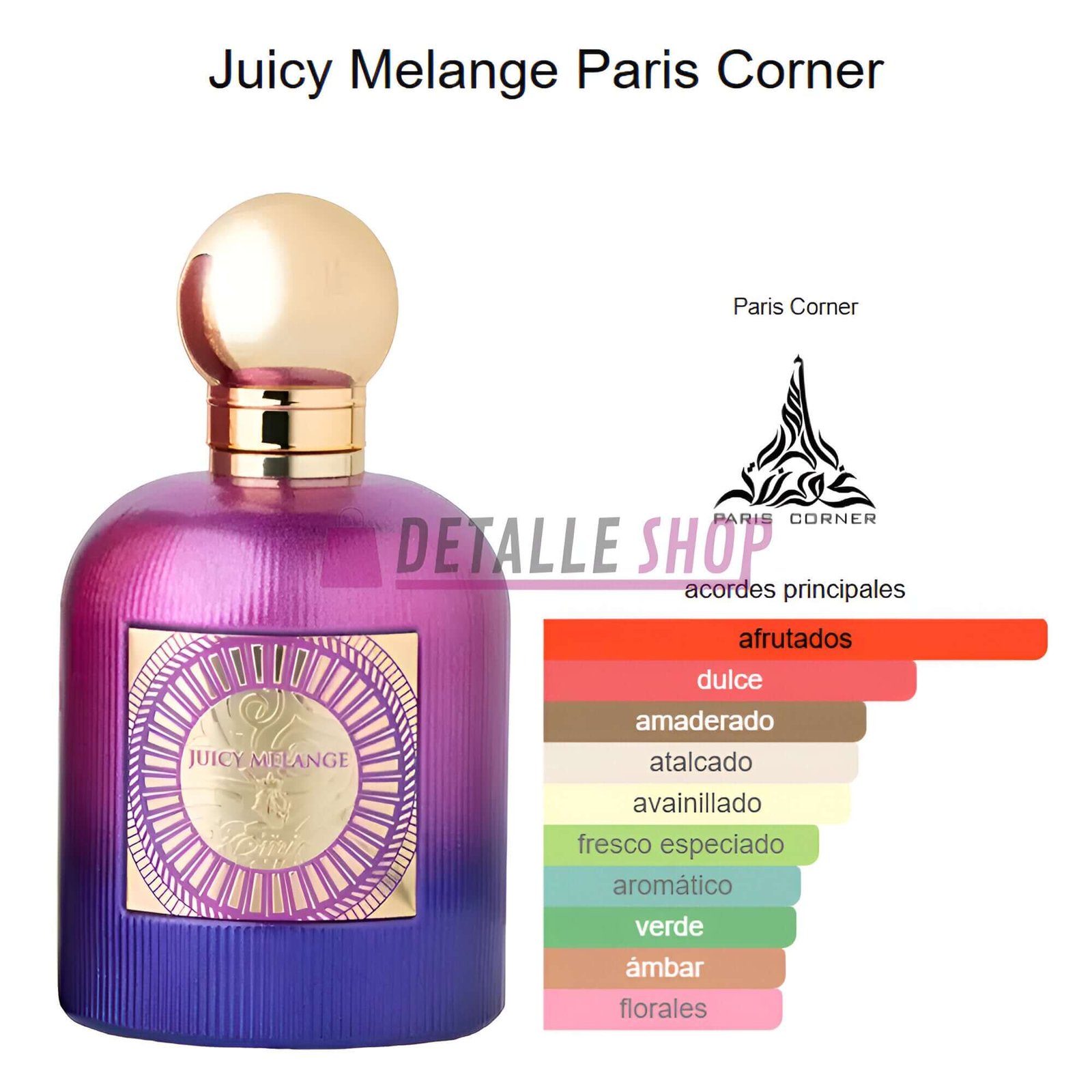 Juicy Melange de Paris Corner es un perfume árabe con notas frutales y dulces. Ideal para quienes buscan una fragancia duradera, exótica y moderna. Perfecto para destacar en cualquier ocasión. ¡Descúbrelo ahora!