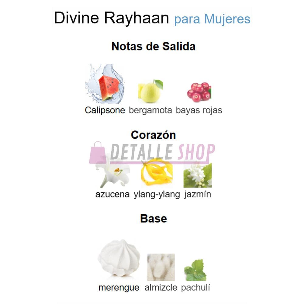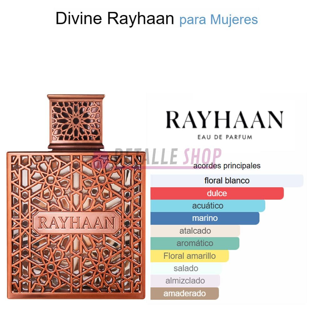 Divine de Rayhaan es un exquisito perfume árabe para mujer, similar a Gaultier Divine. Sus notas de calipsone, bergamota y bayas rojas se mezclan con jazmín, azucena y ylang-ylang, dejando un fondo cálido de merengue, almizcle y pachulí. Elegante, sensual y duradero, ideal para destacar en cualquier ocasión.