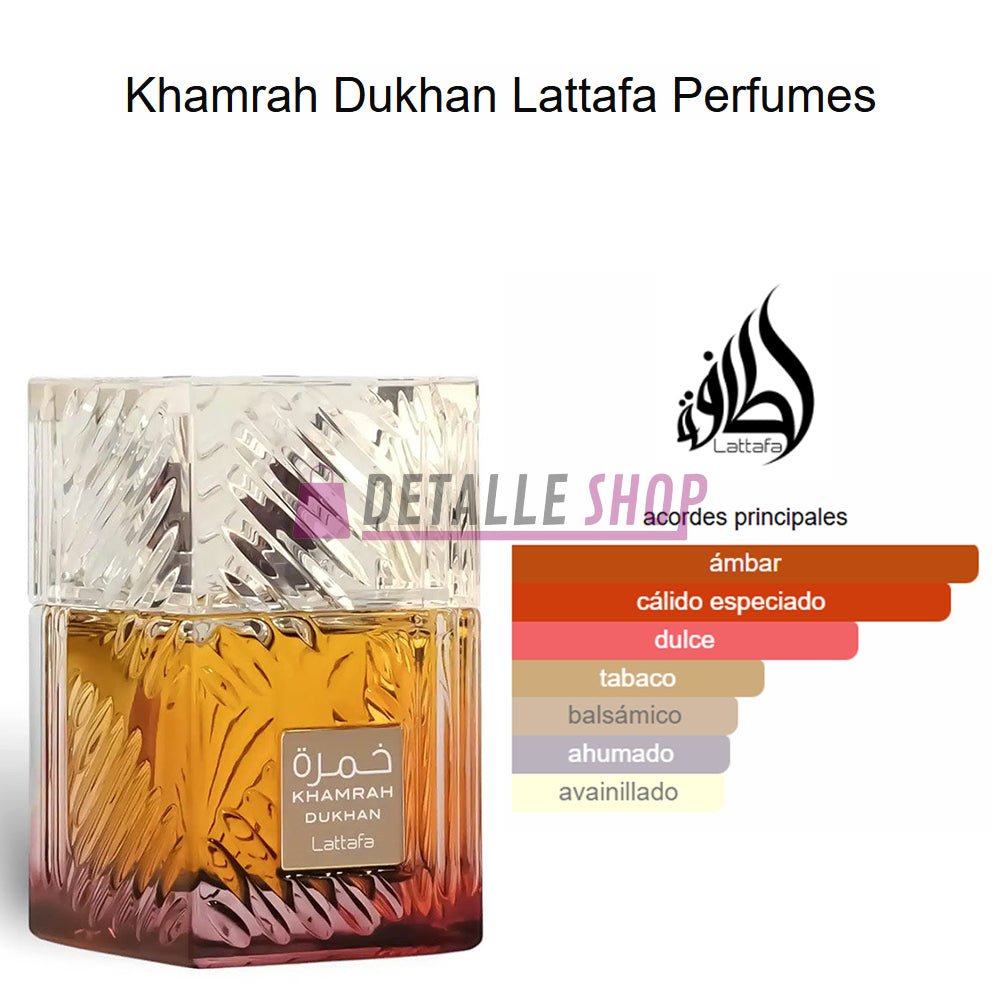 Khamrah Dukhan de Lattafa es un perfume árabe especiado para hombre, con un aroma exclusivo de Dubái. Elegante, intenso y refrescante, es la fragancia perfecta para el verano. Destaca con un toque de lujo oriental que refleja sofisticación y personalidad única.
