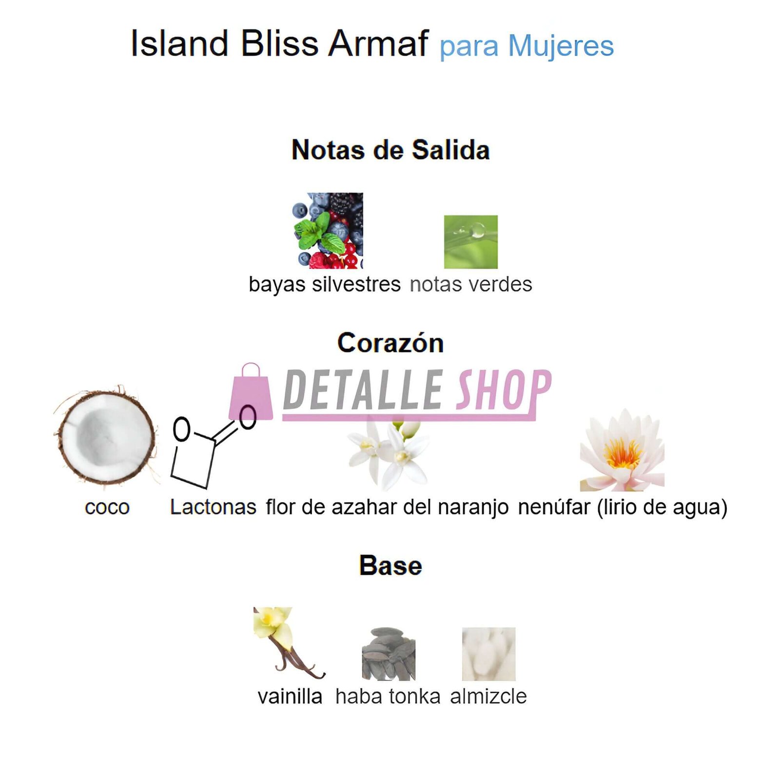 Island Bliss de Armaf es un perfume árabe tropical y exótico. Combina coco cremoso, vainilla y cítricos con un toque de bayas y flores blancas sobre fondo de tonka y almizcle. Dulce, fresco y vibrante, ideal para días soleados.
