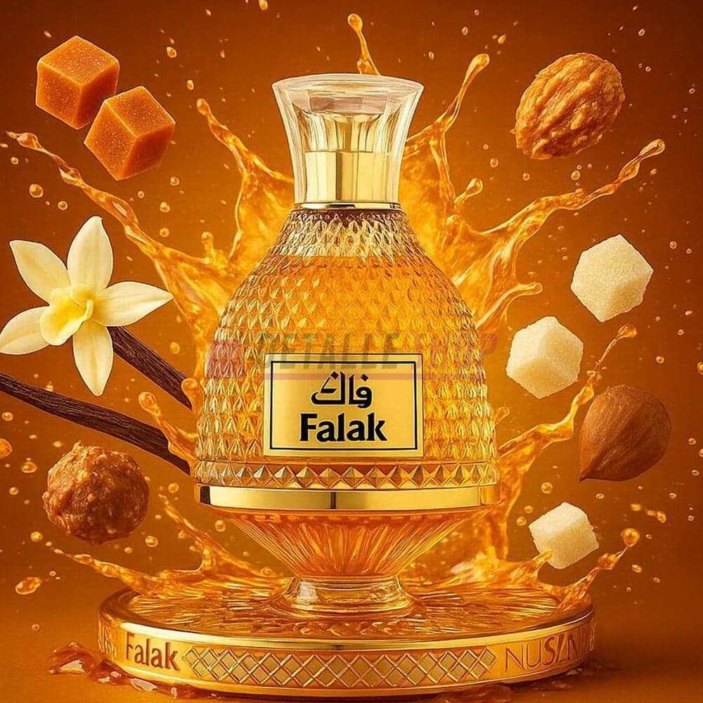 Falak de Nusuk es un perfume femenino gourmand con notas de azúcar moreno, caramelo y vainilla. Dulce, sensual y duradero, perfecto para mujeres que buscan un aroma irresistible y lleno de encanto.