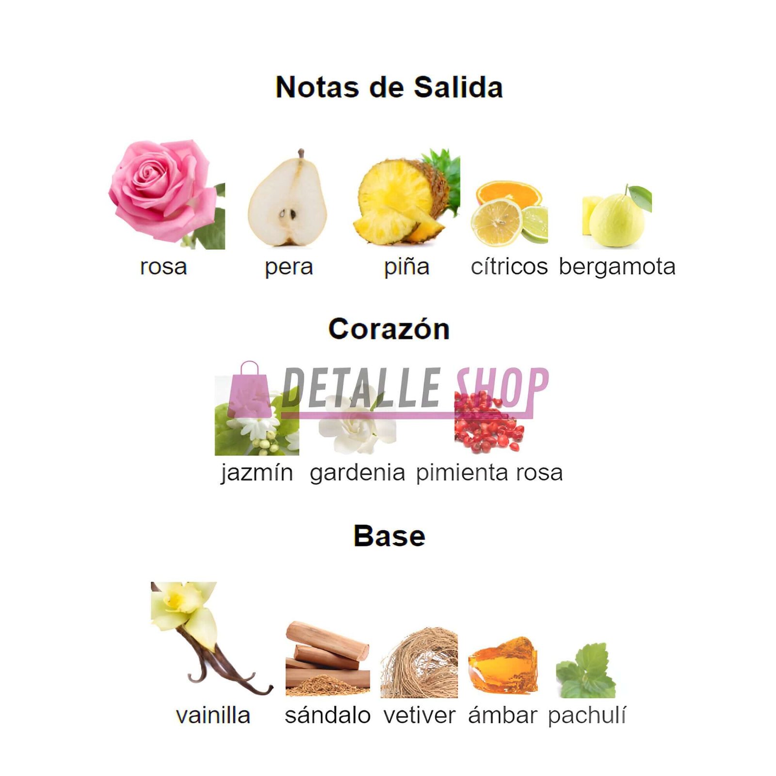 Notas de salida: incluyendo bergamota, rosa, cítricos, pera y piña.
