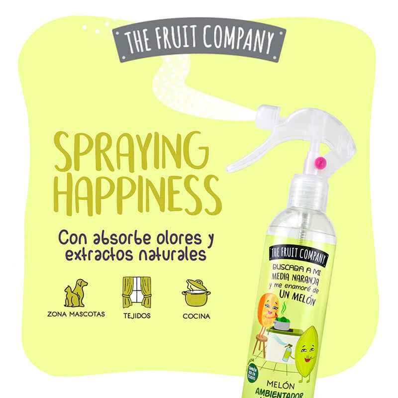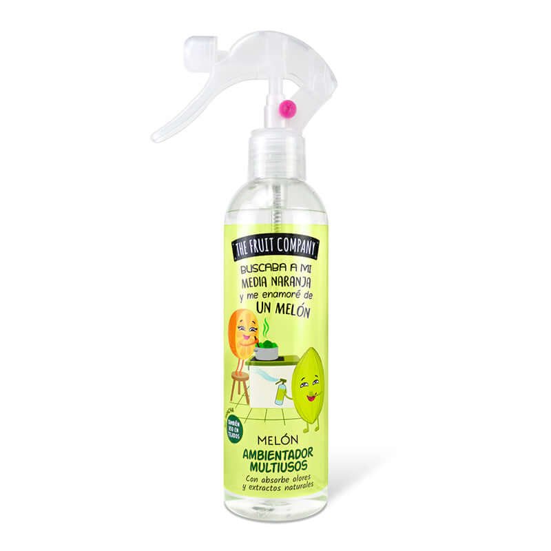 Spray Ambientador de 250 ml con cítrico y frutal aroma a Melón y formulado con extractos naturales. Apto para tejidos, absorbe olores y… ¡No macha!