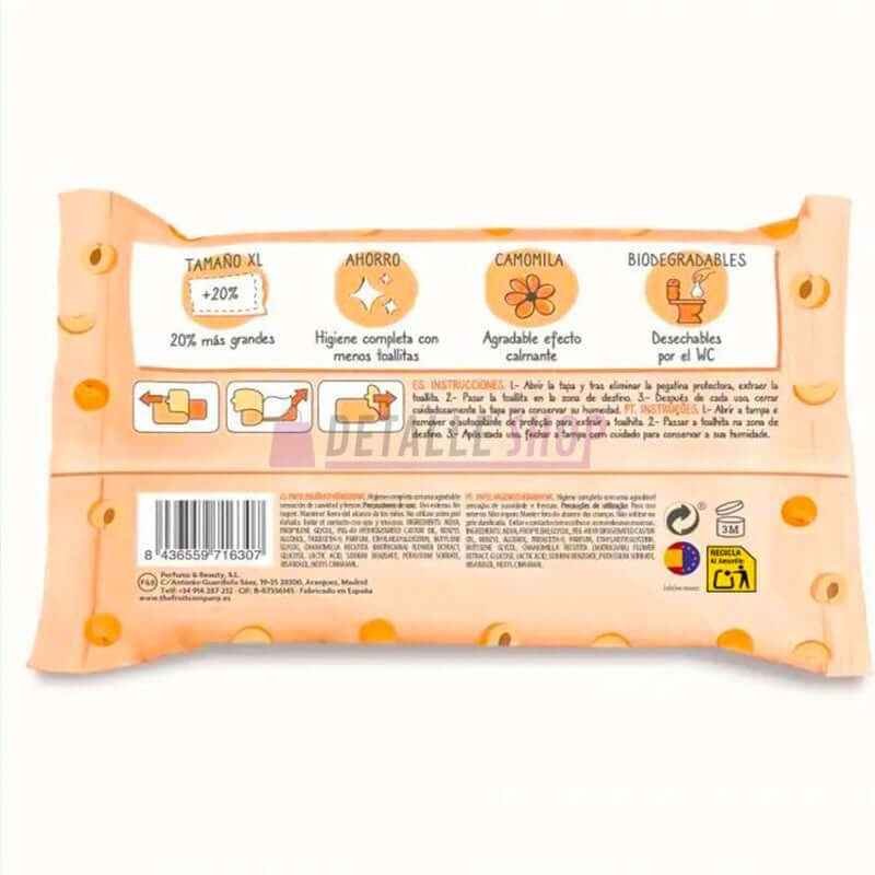 También contiene camomila que limpia, tonifica y suaviza la piel, dejando un culete libre de irritaciones. TOTALMENTE BIODEGRADABLE